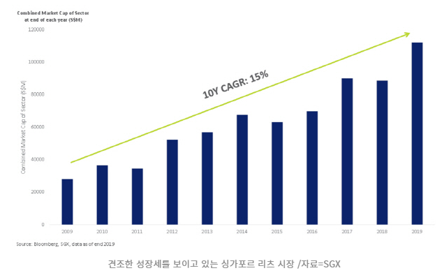 싱가포르는 현재 44개의 리츠가 모두 SGX에 상장되어 있으며, 시가총액은 980억싱가포르달러(약 85조원)