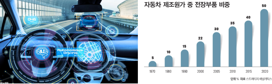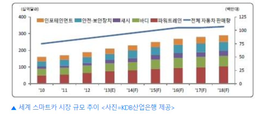 전방산업인 완성차 제조업과 더불어 자동차산업의 경쟁력을 좌우하는 자동차 부품산업은 후방산업인 소재, 전기, 전자 산업 등에 큰 영향을 미치는 산업으로 증가 추세가 꺾여가는 자동차 판매량에 비해 인포테인먼트, 안전 보안장치 등 전기/전자 부품 분야의 비중은 점차 확대되어 가는 추세입니다.