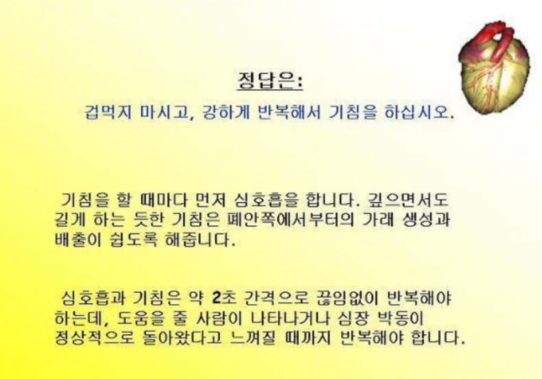 그러면 아래 PPT자료처럼 심정지가 왔을 때, '기침'을 반복해서 하라는 가이드가 많이 보입니다.